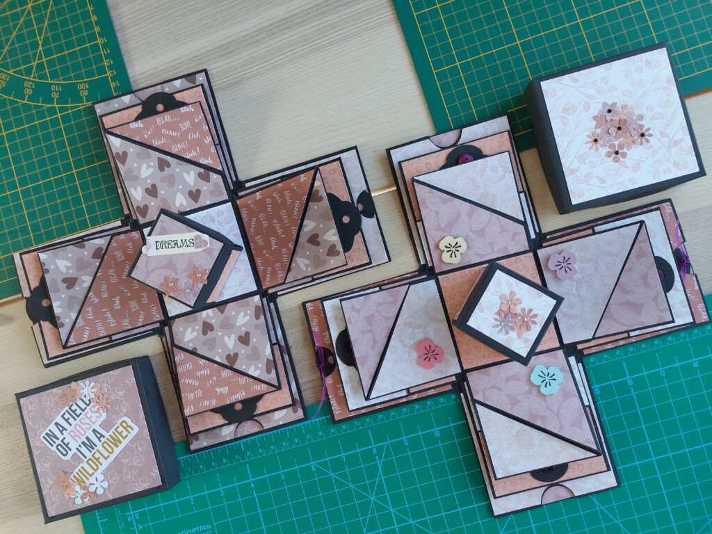 Petra (57 jaar) over workshop Explosionbox “Joy”: Het was eerst niet mijn bedoeling om met de workshop mee te doen. Maar ik ben blij dat ik het gedaan heb. Wat had Iris alles goed voorbereid. Iedereen heeft zijn/haar eigen set “gereedschapset” van scharen, lijm, lineaal, etc. En ze heeft al veel voorbereid zodat je allemaal al een set heeft van de benodigdheden. Dus niet wachten totdat iemand anders klaar is met een schaar, etc. Ik vond het een hele leuke workshop in het Cultuurhuis in Woudenberg en hoop nog eens bij Iris aan mogen schuiven voor een ander. (september 2024)
